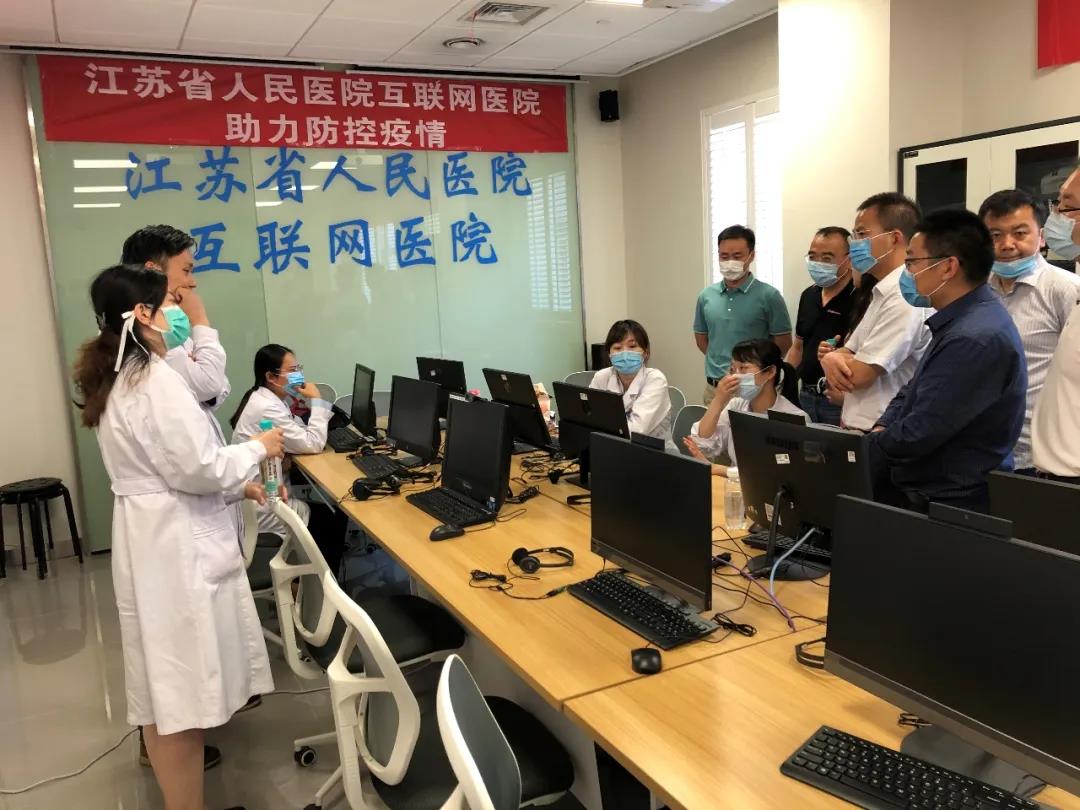 颐东集团参观江苏省人民医院互联网医院现场时,省人医工作人员真情实景演示患者与医生线上整体询医诊断、集团领导对问诊细节逐次进行提问交流、省人医领导为其一一分享经验。