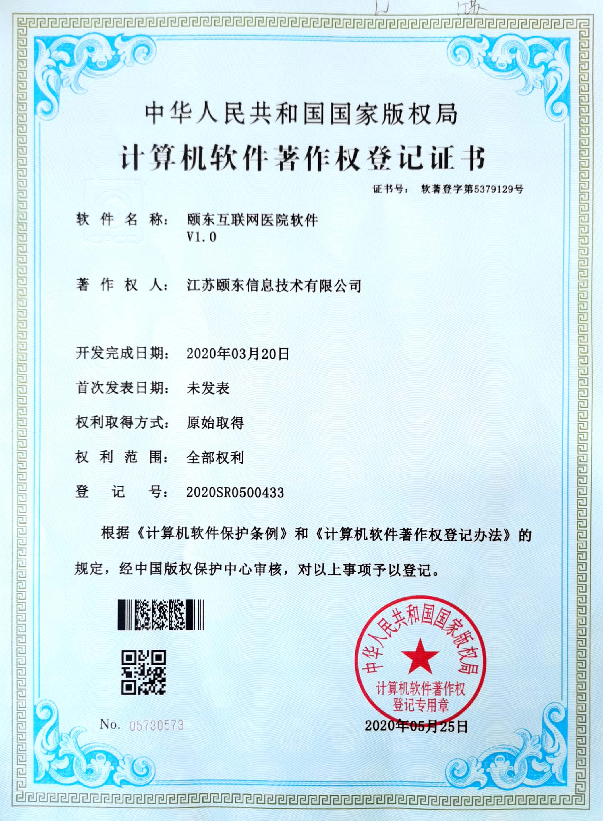 经中华人民共和国国家版权局考证,根据《中华人民共和国计算机软件保护条例》和《计算机软件著作权登记办法》的规定,江苏颐东信息技术有限公司获得计算机软件著作权登记证书:颐东互联网医院。