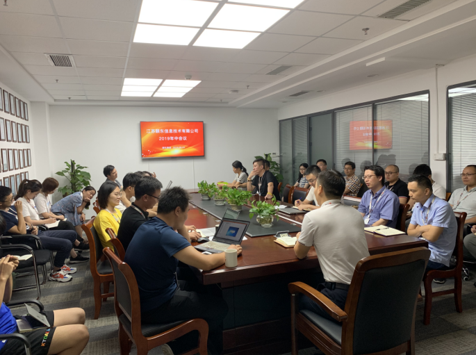 8月23日下午,颐东集团控股的江苏颐东信息技术有限公司年中会议在集团会议室召开,颐东信息中级及以上员工参与会议。