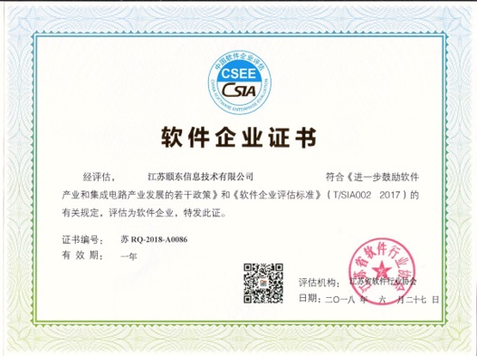 江苏省软件行业协会根据《软件企业评估标准T/SIA002-2017》和《软件产品评估标准T/SIA003-2017》,对江苏颐东信息技术有限公司在软件开发、系统集成、技术服务、软件产品及其质量、人员配置、研发经费等方面进行了严格的考核和评审,认定江苏颐东信息技术有限公司及自主研发的颐东道口拥堵分析检测系统软件V1.0符合软件企业认证和产品认证双重标准,予以颁发证书。