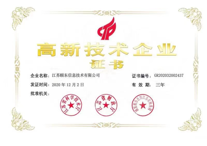 近日,江苏颐东信息技术有限公司顺利拿到由2020年12月2日申报成功的国家“高新技术企业”证书。颐东信息成功认定了国家“高新技术企业”证书表明了颐东信息在核心自主知识产权、科技成果转化能力、研究开发的组织管理水平、成长性指标以及人才结构的综合评估上得到了国家的认可,亦是证明了颐东信息凭借专业的研发队伍、雄厚的技术实力、持续的创新能力和科学的企业管理能够正式迈入国家高新技术企业行列。高企认定的通过,是对颐东信息在技术创新、知识产权、研发能力及企业成长等方面得到的官方认可,是企业发展的一个重要里程碑。