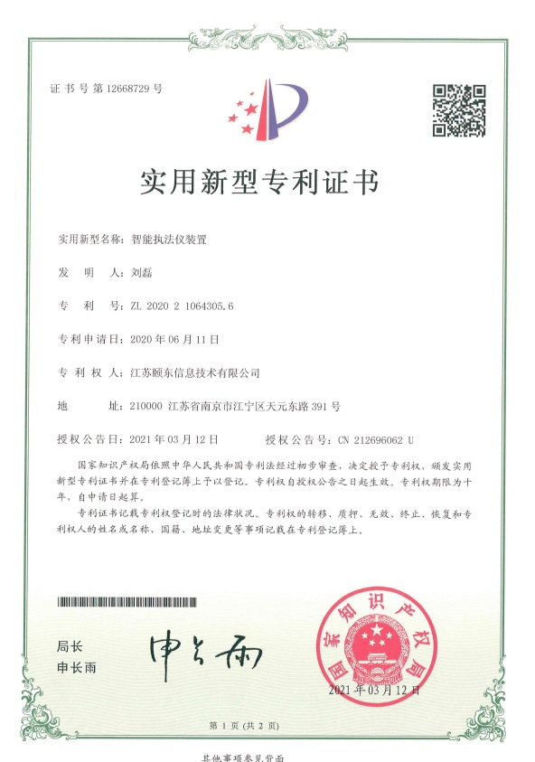 近日,江苏颐东信息技术有限公司申报的“智能执法仪装置”喜获国家实用新型专利授权。